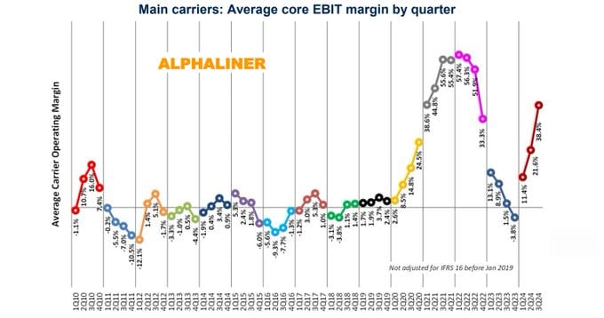 According to logistics advisory firm Alphaliner, average operating margins for the leading container carriers (the nine largest companies reporting Earnings before Interest and Tax or EBIT) reached 38.4% in the latest quarter, equivalent to levels last seen in early 2021.