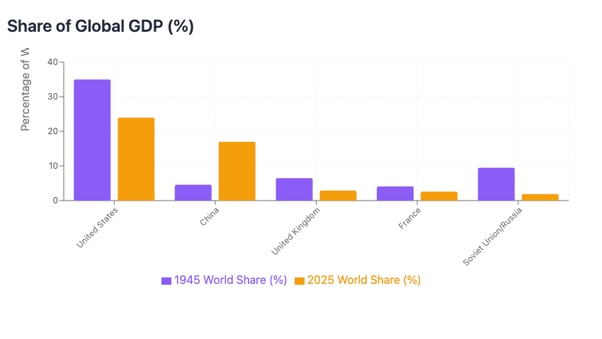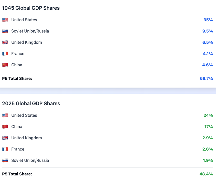 This would also better reflect global economic power. In 1945, when the Security Council was established, the five permanent members constituted about 60% of global GDP; they now constitute less than half. But it's so much more skewed than that - it’s only that high because China’s recent rise boosts the proportion. The UK, France, and Russia represent no greater slice of global GDP than a host of other countries. And these are not just the countries that lost during WWII, Germany and Japan. There is the country most egregiously left out, India, and a bunch of others.