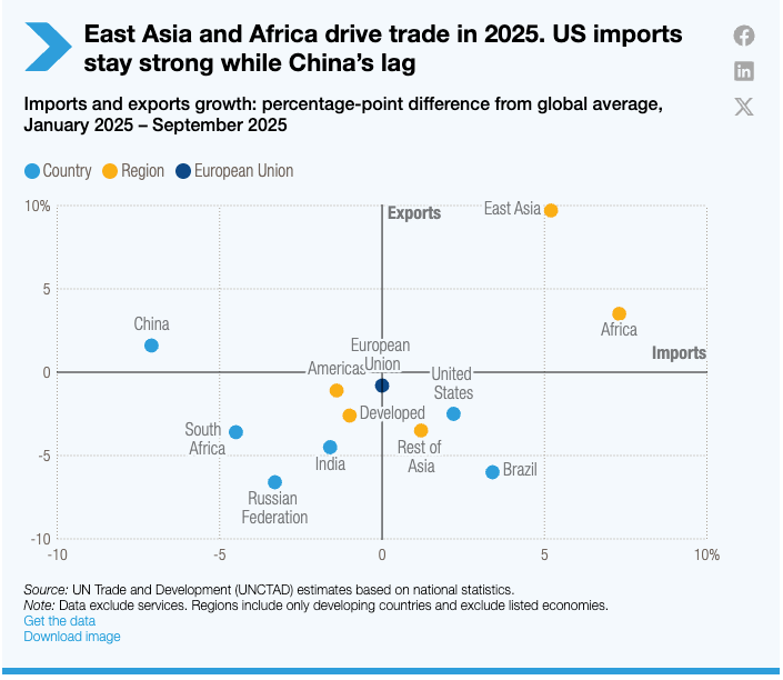 The best example is that global trade is on course to exceed a record $35-trillion this year, a nominal 7% year-on-year increase, according to UN Trade and Development’s (Unctad's) year-end Global Trade Update. Who would have thought that would be the case in a year beginning with Trump increasing tariffs on Chinese goods first to 10% in February, 20% in March, 34% at the start of April, 104% later that month, and then finally settling on 145%.