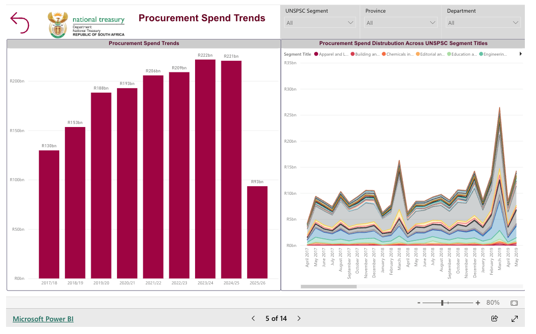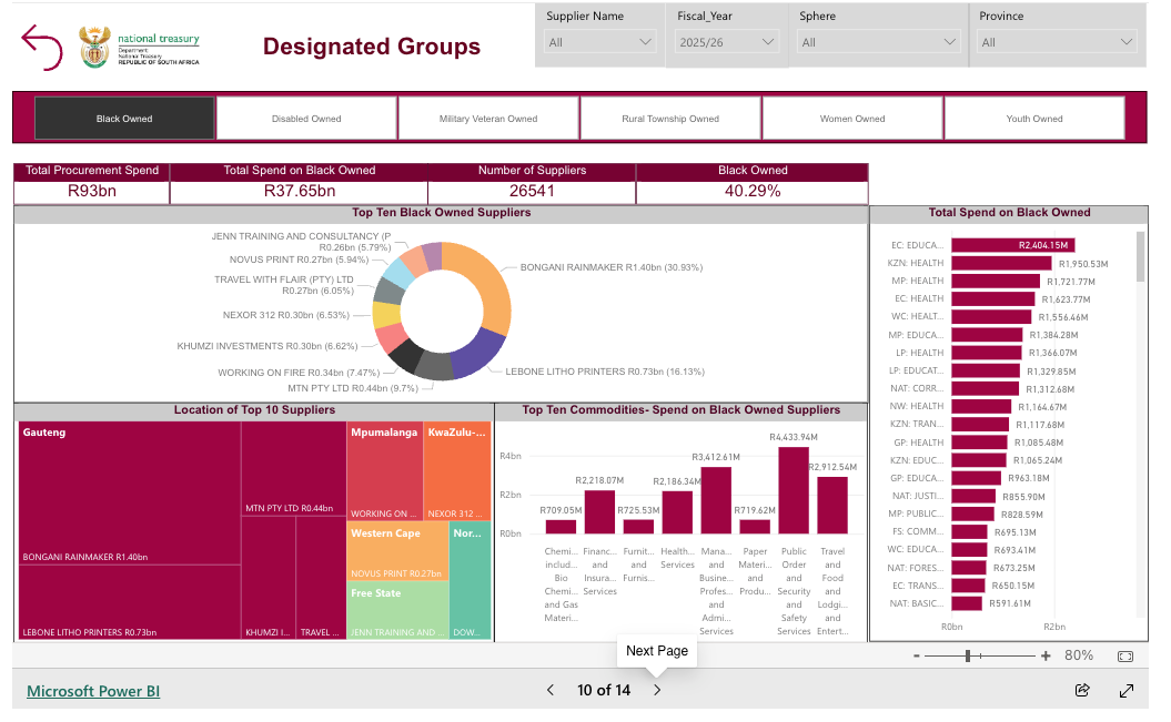 The dashboard shows a raft of graphs showing the racial, gender, and youth breakdown, which together constitute about 40% of the total spend. This is our political moment, so, understandably, they have to do this kind of breakdown. The only point I would make is that there are over 26,000 black-owned suppliers, which shows you what a large political constituency this group has become.